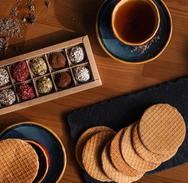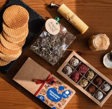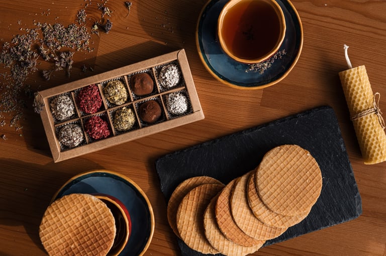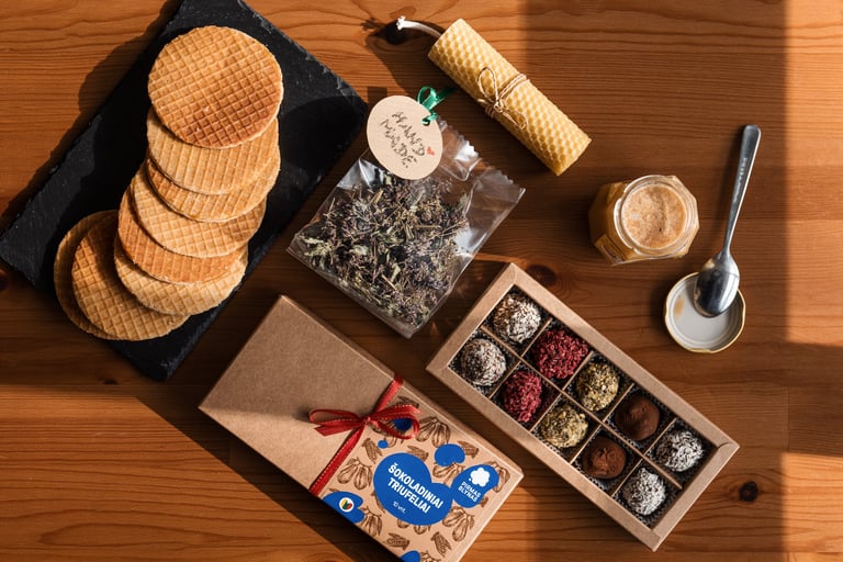 - Olandiški karameliniai vafliai (8 vnt.) - Veganiški šokoladiniai triufeliai (10 vnt.) - Ekologiškas medus
